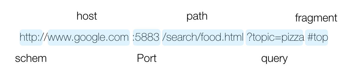 schem://<user>:<password>@<host>:<port>/<url-path> 가장 많이 사용되는 HTTP URL의 표현방법 http://<host>:<port>/<path>?<searchpart> |