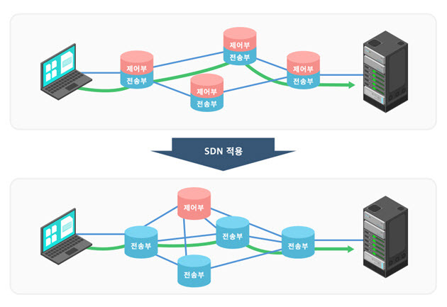 이러한 것을 SDN에서는 경로 계산을 위한 제어부와 데이터 전송을 위한 전송부를 분리하여 하나로 집중합니다.