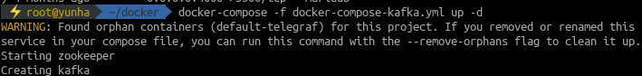 저는 docker-compose.yml 파일 명을 docker-compose-kafka.yml로 하였기 때문에 docker-compose.yml을 실행할 때 -f 옵션을 사용하여 실행하였습니다.