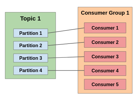 만약 4개의 Consumer로 구성된 Consumer Group이 4개의 파티션이 있는 'Topic 1'을 소비하게 된다면 아래와 같이 각 Consumer가 파티션을 하나씩 소유하여 데이터를 읽어가게 될 것입니다.