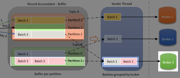 Piggyback은 '등 뒤에 업다'라는 뜻입니다. 예를 들면, 토픽 B의 파티션1의 큐에 레코드 배치가 전송 조건을 만족했다고 가정하겠습니다. Sender는 해당 레코드 배치를 가져와 Broker3에게 전송할 준비를 합니다. 이때, 토픽 A의 파티션2가 전송 조건을 만족하지 않았더라도 같은 Broker3에게 전송 되어야 하므로, Sender는 토픽 A의 레코드 배치를 업어 한번에 3번 브로커로 전송합니다.