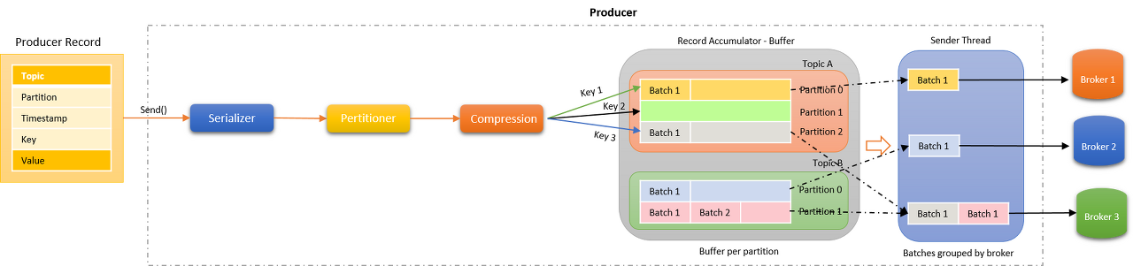 - producer는 적은 네트워크 요청을 위해 동일한 파티션에게 보낼 레코드를 일괄처리 하는데 기본 배치 크기를 제어하여 클라이언트와 서버 성능 모두를 향상시킵니다.