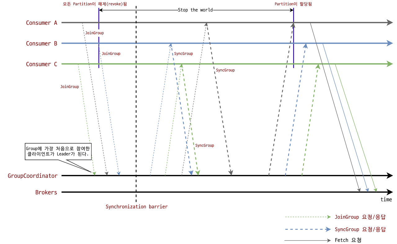 Consumer Group 멤버십에 변화가 생겼을 때, Rebalancing 과정에서 Consumer Client와 Group Coordinator 간의 요청/응답 메시지 전달이 이루어집니다.