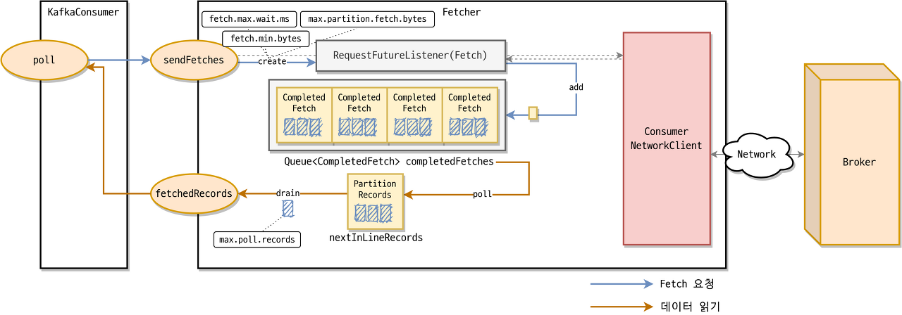 consumer가 얼만큼의 데이터를 가져올 것인지 max.partition.fetch.bytes와 fetch.min.bytes를 설정하여 데이터를 가져오게 됩니다.
