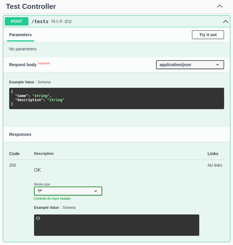 위 DTO를 Request Body로 받는 Controller를 정의해 주었고 Swagger를 통해 API 테스트를 해보았습니다.