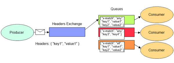 | Headers | [key:value]로 이루어진 header 값을 기준으로 일치하는 Queue에 메세지 전송 (모든 header가 일치할 때, 하나라도 일치할 때 메세지 전송 등의 옵션을 줄 수 있다) |