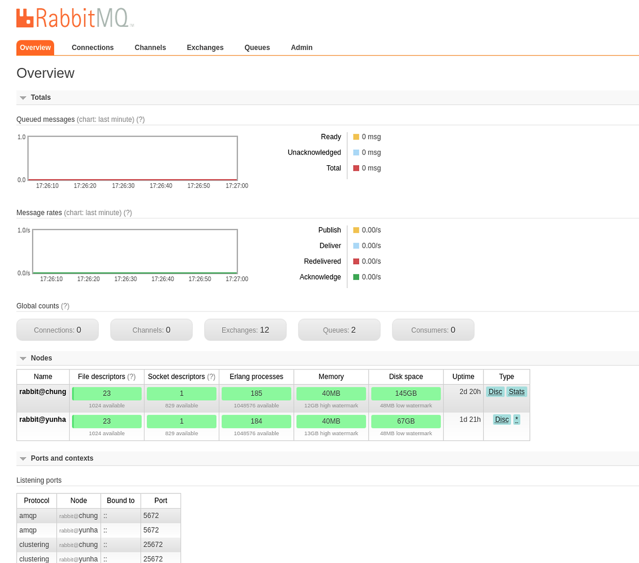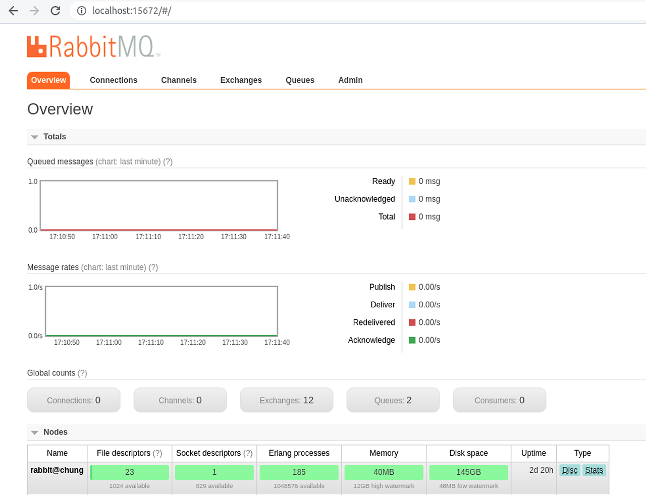 정상적으로 RabbitMQ가 설치된 경우 아래와 같이 RabbitMQ Management를 통해 노드 및 큐 정보를 확인할 수 있습니다.