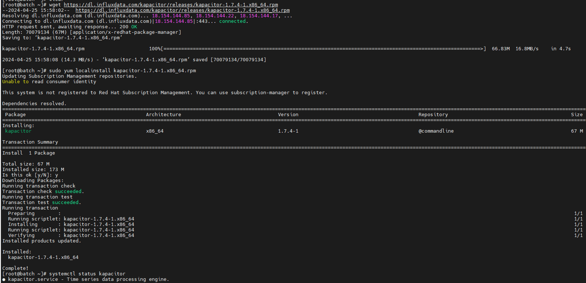 $ sudo yum localinstall kapacitor-1.7.4-1.x86_64.rpm